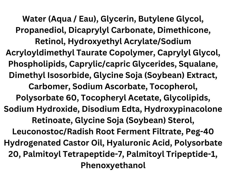 Water (Aqua / Eau), Glycerin, Butylene Glycol, Propanediol, Dicaprylyl Carbonate, Dimethicone, Retinol, Hydroxyethyl Acrylate/sodium Acryloyldimethyl Taurate Copolymer, Caprylyl Glycol, Phospholipids, Caprylic/capric Glycerides, Squalane, DMI, Glycine Soja (Soybean) Extract, Carbomer, Sodium Ascorbate, Tocopherol, Polysorbate 60, Tocopheryl Acetate, Glycolipids, Sodium Hydroxide, Disodium Edta, Hydroxypinacolone Retinoate, Glycine Soja (Soybean) Sterol, Leuconostoc/Radish Root Ferment Filtrate, Peg-40 Hydrogenated Castor Oil, Hyaluronic Acid, Polysorbate 20, Palmitoyl Tetrapeptide-7, Palmitoyl Tripeptide-1, Phenoxyethanol
